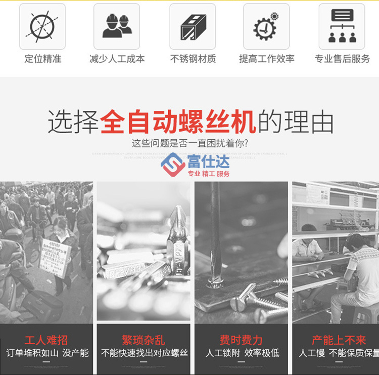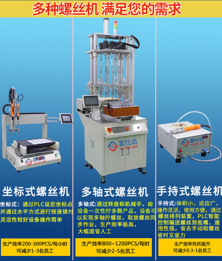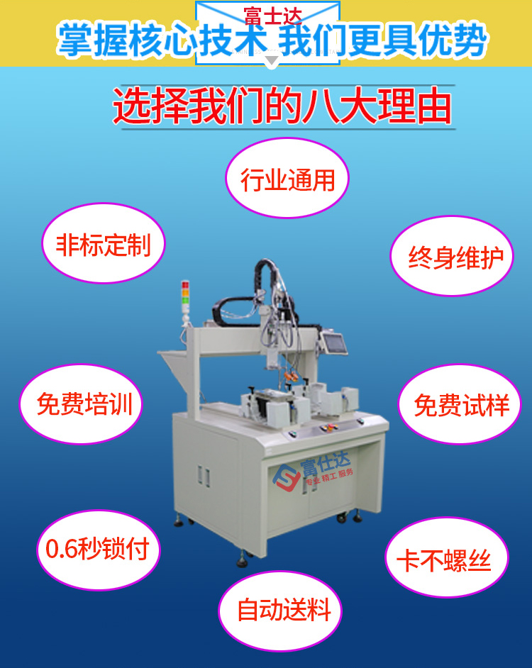 深圳市富仕達(dá)自動(dòng)化設(shè)備有限公司是國(guó)內(nèi)領(lǐng)先的以自動(dòng)鎖螺絲設(shè)備為核心的自動(dòng)化設(shè)備制造商,堅(jiān)持以客戶需求為中心,定制自動(dòng)化鎖螺絲方案,已有超過9000家企業(yè)采用富仕達(dá)定制的自動(dòng)鎖螺絲設(shè)備實(shí)現(xiàn)“機(jī)器換人”,節(jié)省大量人力成本。