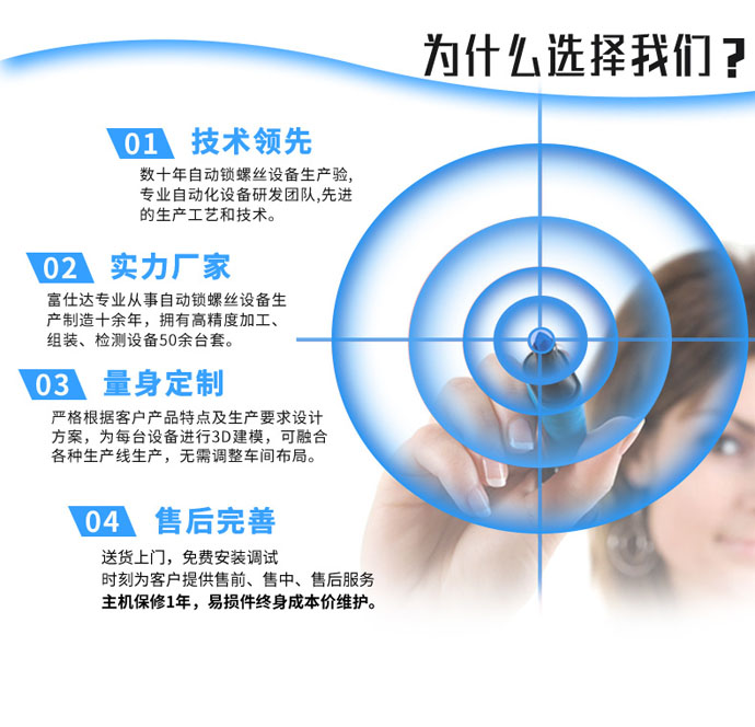 富仕達擁有獨立研發(fā)設計團隊,200多位自動化高級工程師,5000㎡自動鎖螺絲機生產、測試車間,專業(yè)售后服務團隊,為客戶提供方案設計、設備制造、操作培訓、售后服務等一站式服務。 公司將持續(xù)提升技術創(chuàng)新和產品服務方面的優(yōu)勢,堅持“專業(yè)、精工、服務”的企業(yè)理念,聚焦于自動鎖螺絲設備生產,通過系統的一站式解決方案,真正的幫助客戶提升效率、降低成本,提升客戶的核心競爭力。
